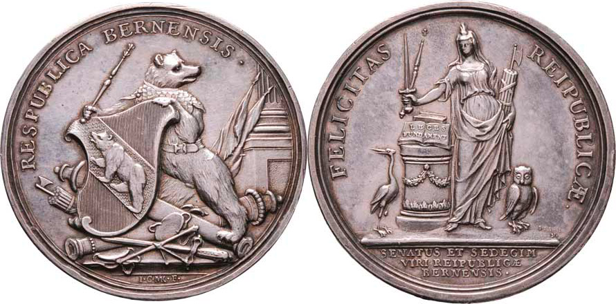 Bern - AR medaile na vydání ústavy b.l. - medvěd drží znak, opis / alegorie Republiky, opis a nápis, Sign. Dassier, Ag 57mm, 91.785g, nep.hr., nep.rysky, patina