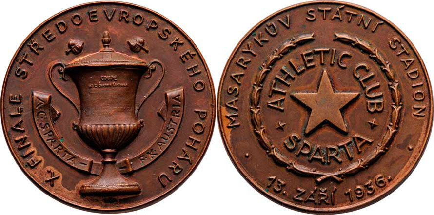 Praha 1936 - Sparta/Austria - finále středoevropského poháru 13.IX., Sign.Hám, patinovaný bronz 34 mm