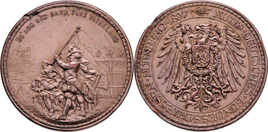 Norimberk 1897 - XII.něm.spolk.střelby - proporečník, krajina, opis / německý znak, opis, Sign. Lauer, postříbř.měď 40mm, 27.135g, velké hrany, rys., patina