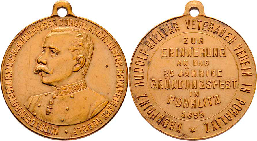 Pohrlitz (Pohořelice u Břeclavi) 1898 - Spolek korun. prince Rudolfa - 25 let trvání spolku, Nesign., mosaz 30 mm s původním raženým ouškem, vlas.škr., patina