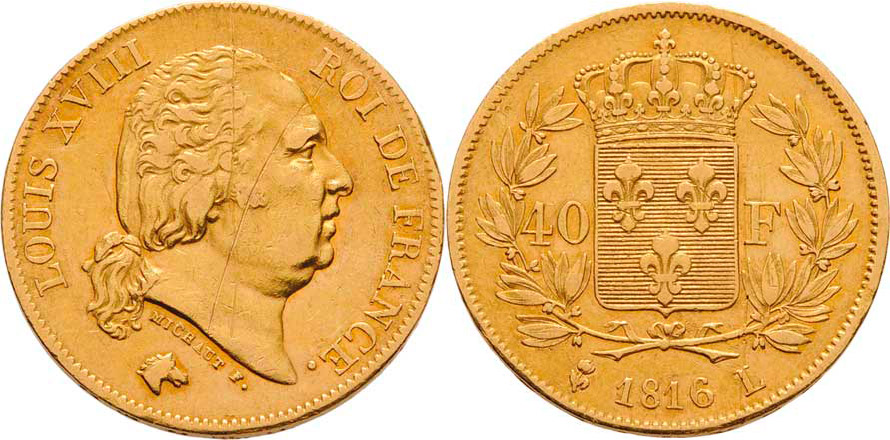 40 Frank 1816 L, Bayonne, KM.713.4 (Au900, pouze 2.923 ks), 12.842g, 3x škr., hr., dr.rysky, pěkná patina RR!