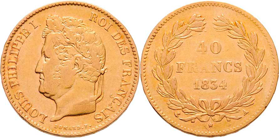 40 Frank 1834 A, Paříž, KM.747.1 (Au900), 12.886g, dr.hr., dr.rysky, dr.škr., pěkná patina