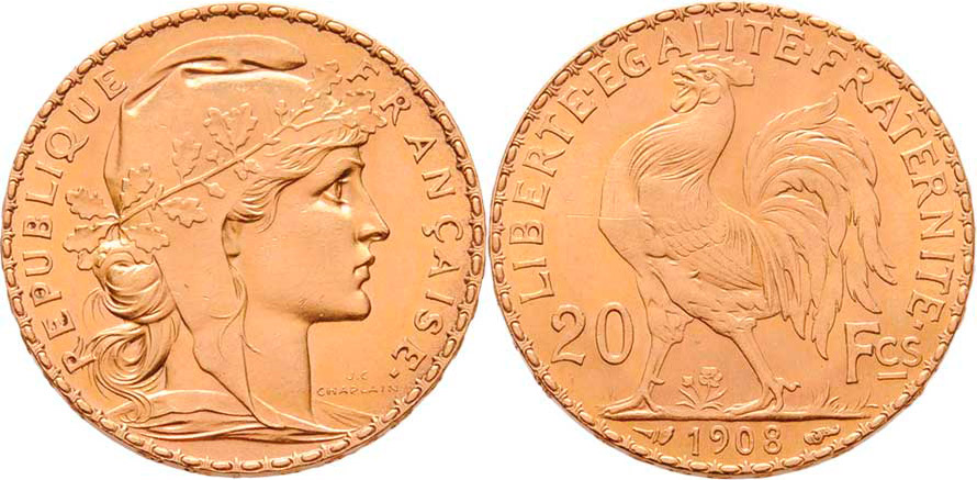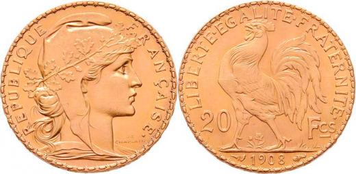 20 Frank 1908, KM.857 (Au900), 6.453g, nep.hr., nep.rysky, dr.škr., téměř