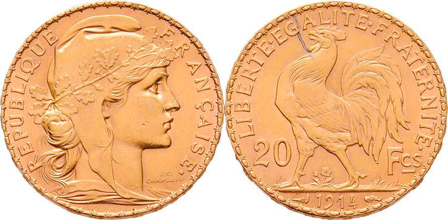 20 Frank 1914, KM.857 (Au900), 6.445g, nep.hr., dr.rysky, škráb., nep.úhoz
