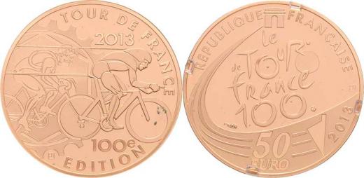 50 Euro 2013 - 100 let Tour de France, KM.2115 (Au920, 8.45g, pouze 1.500 ks), kapsle, etue, přebal, certifikát RR!
