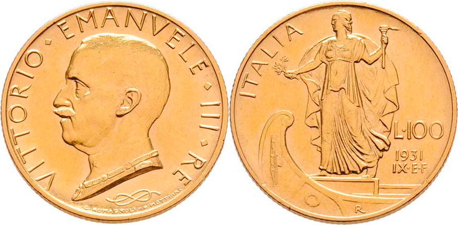 100 Lira 1931 R - IX.rok vlády, KM.72 (Au900, pouze 34.000 ks), 8.787g, nep.hr., nep.rysky, téměř R!