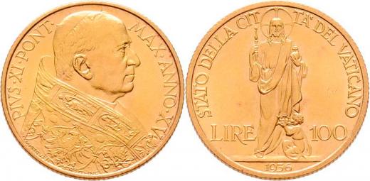 100 Lira 1936 - XV.rok pontifikátu, Y.10 (Au900, pouze 8.239 ks), 5.192g, nep.hr., dr.rysky, téměř RR!