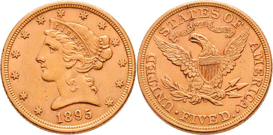 5 Dolar 1895 - hlava Liberty, KM.101 (Au900), 8.347g, nep.hr., dr.rysky, pěkná patina