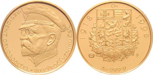 Bejvl - T.G.Masaryk - osmdesát let ČSR 1918/1998 - hlava zleva, opis/ státní znak v lipovém věnci, opis, Sign., Au999, 23mm, (7.78g), kapsle, etue, certifikát