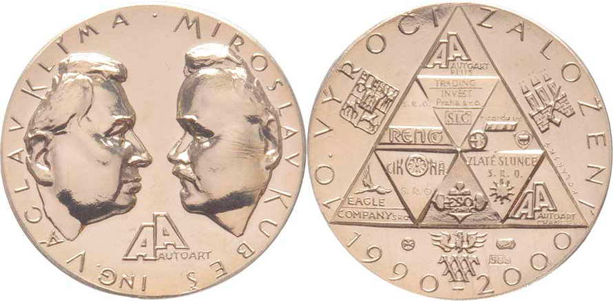 Kolářský - V.Klíma a M.Kubeš - 10 let spol. Autoart 2000 - portréty, emblém, opis / emblémy, znaky, opis, Sign., Punc. Au585, 22mm, 10.598g, kapsle, etue, text