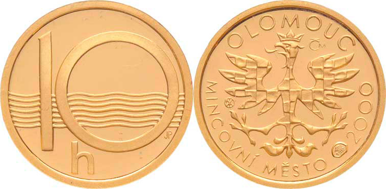 Prádler, Kartáková - mincovní město Olomouc 2000 - moravská orlice, opis / replika reversu 10-haléře, Au999, 16mm, 4.990g, kapsle