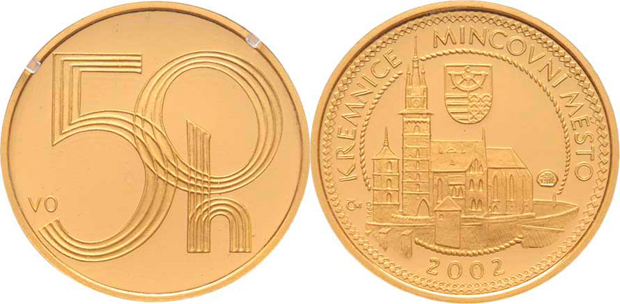 Oppl - mincovní město Kremnice 2002 - chrám, znak, opis / replika Rv. padesátihaléře, Sign., Au999, 19mm, 5.063g, kapsle