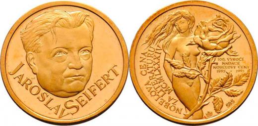 Jaroslav Seifert - 100 let Nobelovy ceny 1995 - hlava mírně zprava, opis / dívka s růží, písmo, Nesign., Au585, 20mm, 3.517g, etue, certifikát (č.25), pat.