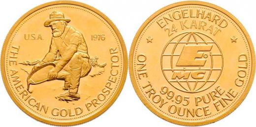 Uncová medaile 1976 - zlatokop při práci, vročení, opis / emblém firmy Engelhard, dvojitý opis, Nesign., Au999, 34mm, 31.168g, nep.rysky
