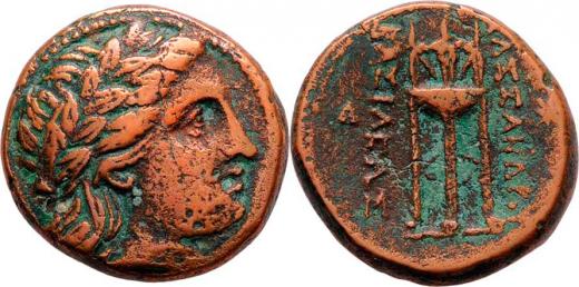 AE 18mm, Hlava Apolona zprava / trojnožka a nápis ve dvou řádcích, SG.6755, 6.609g, patina