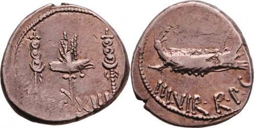 AR Denár, orel mezi standartami, nápis "LEG.XIII." / galéra a opis "ANT.AVG.III.VIR.R.P.C.", Seaby.42, Crawford.544/27, Alb.1728, oválný střížek, ned., pat.