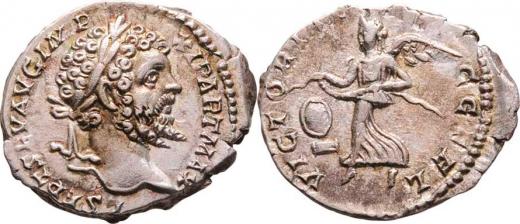 AR Denár, Rv:"VICTORIAE.AVGG.FEL." Victoria zleva, štít, S.1691, RIC.144b - mincov. Řím - ražba z let 198 - 200, nepravidelný okraj střížku, pěkná patina