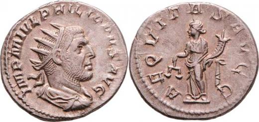 AR Antoninianus, Rv:"AEQVITAS.AVGG.", stoj. Aequitas, S.2451, RIC.27b - minc. Řím - ražba z let 244 - 247, nep.exc., nep.nedor., pěkná patina