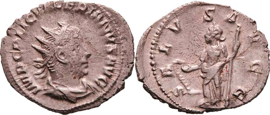 AR Antoninianus, Rv:"SALVS.AVGG.", stojící Salus, S.2797, RIC.121 - mincovna Řím - ražba z roku 254, nepravidelný tvar střížku, nep.vady mat., pěkná pat.