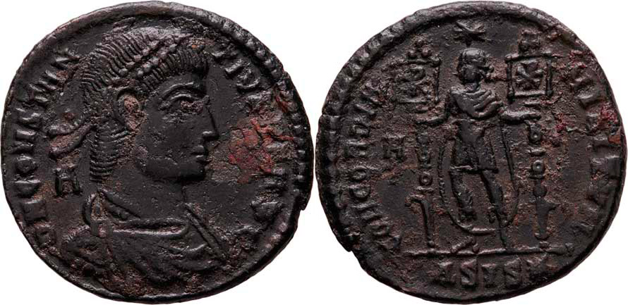 Maiorina, Rv:"CONCORDIA.MILITVM.", S.0, RIC.8.276 (stojící císař se dvěma standartami) - Siscia - 4.dílna - ražba z roku 350, mírně kor., patina