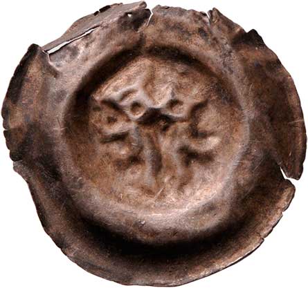 Brakteát moravský, Ca.1001, F.XXII/18 (2205 a 2348), 0.368g, mírně poprskaný, nep.odlomený okraj, patina