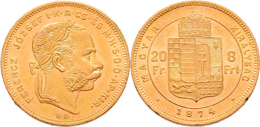 8 Zlatník 1874 KB, 6.434g, dr.hr., nep.rysky, pěkná patina, téměř
