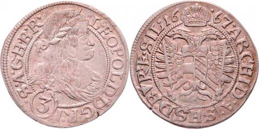 3 Krejcar 1667 SHS, Vratislav-Hammerschmidt, dělení opisů: "...R.I.(3).S.A.../...A.(SHS).D.BVR.ET.SIL.", MKČ.1619, Nech.737, 1.626g, dr.vady materiálu