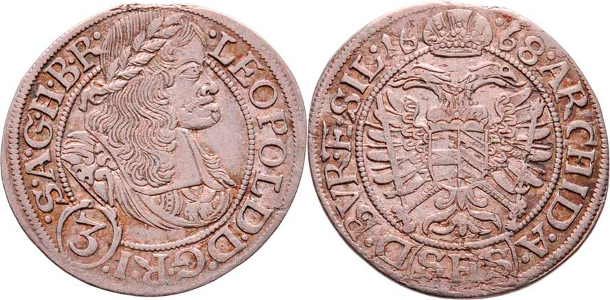 3 Krejcar 1668 SHS, Vratislav-Hammerschmidt, dělení opisů: "...R.I.(3).S.A.../...A.(SHS).D.BVR.ET.SIL.", MKČ.1619, Nech.738, 1.647g, krajový střížek