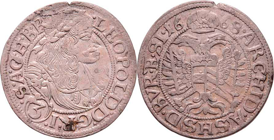 3 Krejcar 1668 SHS, Vratislav-Hammerschmidt, dělení opisů: "...R.I.(3).S.A.../...A.(SHS).D.BVR.ET.SI.", MKČ.1619, Nech.738, 1.967g, nedor., patina R!