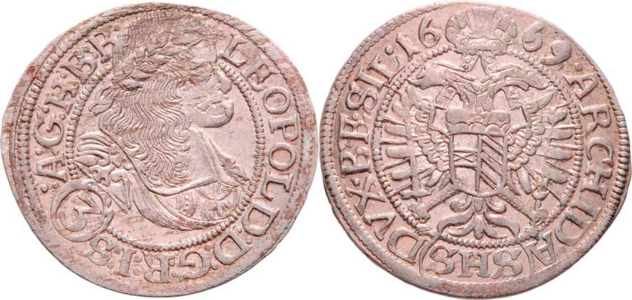 3 Krejcar 1669 SHS, Vratislav-Hammerschmidt, dělení opisů: "..:G:R:I:S (3):A:../..A.(SHS).DVX.B.ET.SIL.", MKČ.1621, Nech.739, 1.830g, dr.vady materiálu R!