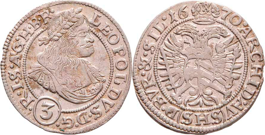 3 Krejcar 1670 SHS, Vratislav-Hammerschmidt, dělení opisů: "LEOPOLDVS.D.G.(3).R.I./.AV.(SHS).D.BVR.&...", MKČ.1625, Nech.742, 1.783g, nep.nedor., patina RR!