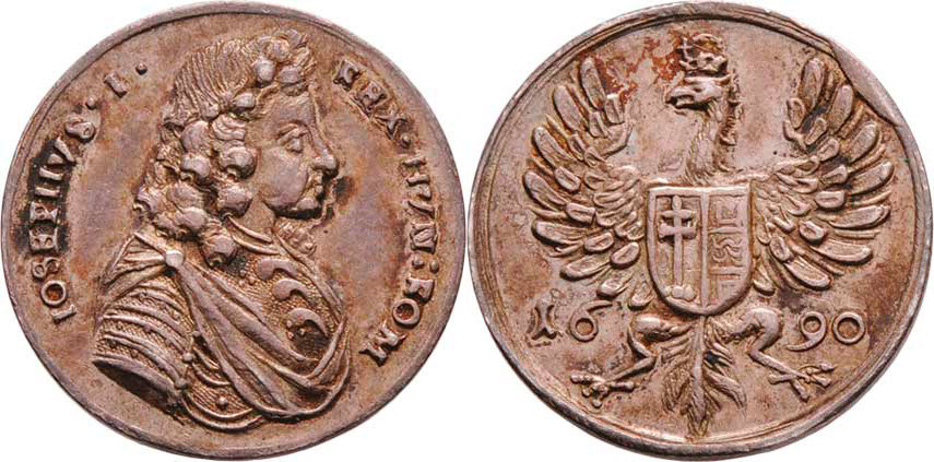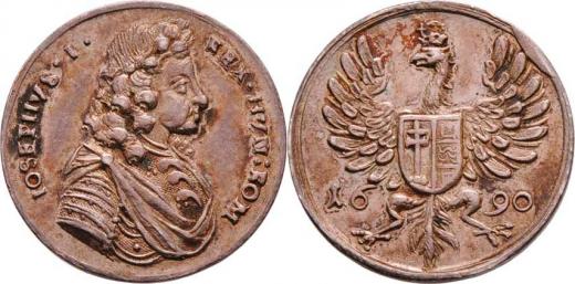 Medailka na korunovaci v Augsburgu 26.1.1690 - poprsí zprava, opis / korunovaná orlice, vročení, Ag 17mm, 2.440g, Novák.X.B.27a, M.1247, H.2430, pat.