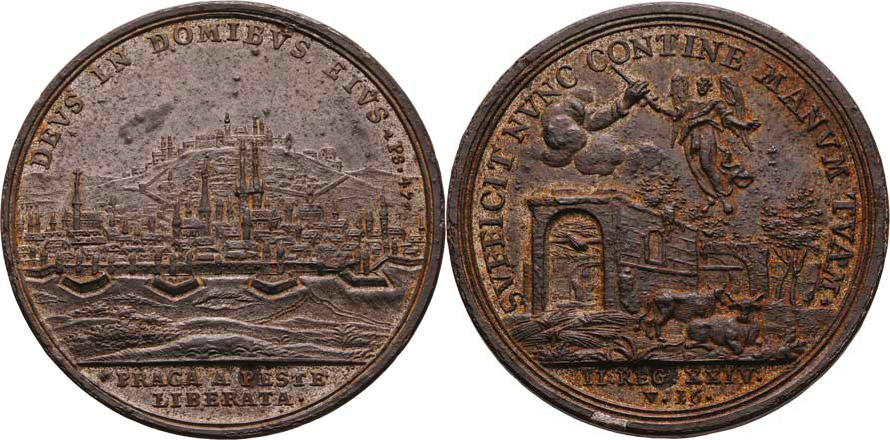 Vestner - cín.medaile na vymizení moru v Praze (1715) - pohled na město, písmo / Boží ruka zadržuje anděla s mečem, krajina, písmo, 44mm, Don.4828, patina RR!