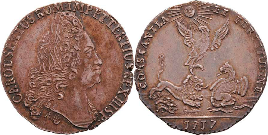 Roettiers - AR pamětní jeton 1717 - poprsí zprava, opis / slunce, orel, lev s lvíčaty a drak, opis, Sign.R, 26mm, 4.501g, H.2601(AE), vada mat., pat. RR!