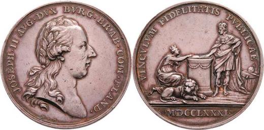 Berckel - AR 40mm na holdování ve Flandrech 1781 - poprsí zprava, opis / holdovací scéna, písmo, Sign., 25.755g, M.2139, H.3155, Nov.H.3b, dr.rysky, patina