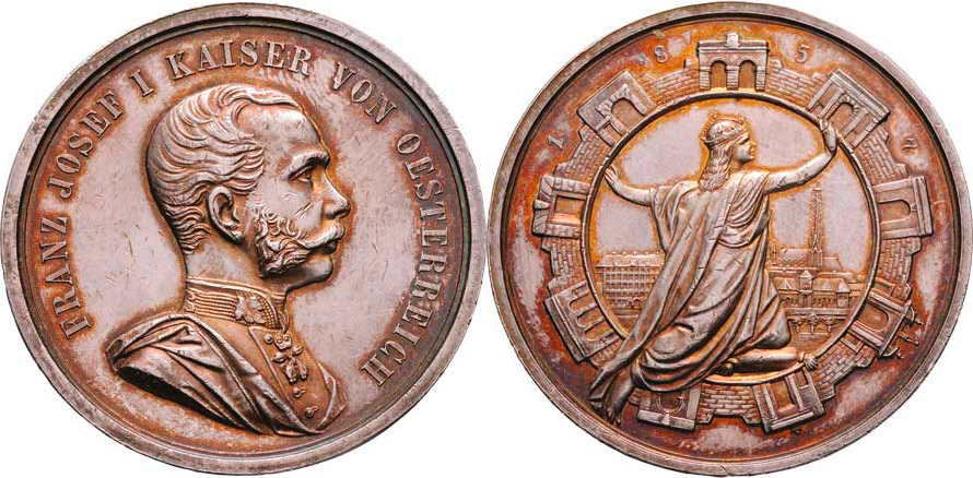 Seidan - AR medaile na otevření Ringstrasse 1857/1865 - poprsí zprava, něm.opis / Vindobona bořící hradby, nápis na hraně, Sign., 44mm, 34.929g, dr.hr.,dr.rysky