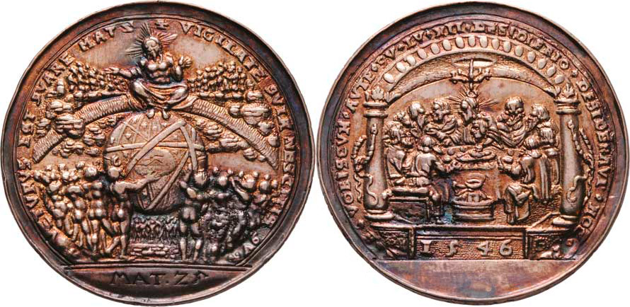Poslední večeře Páně, opis, 1546 / Kristus na globu mezi Pannou Marií a Janem Křtitelem, opis, Katz.347, Don.4341, lité Ag 55mm, 24.624g, věnování na hraně !