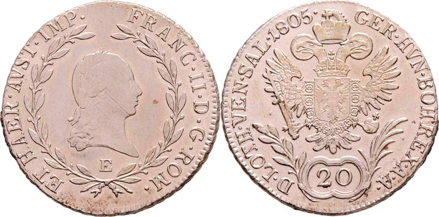 20 Krejcar 1805 E, Karlovský Bělehrad, 6.481g, mírně just., nep.hr., nep.rysky, téměř R!