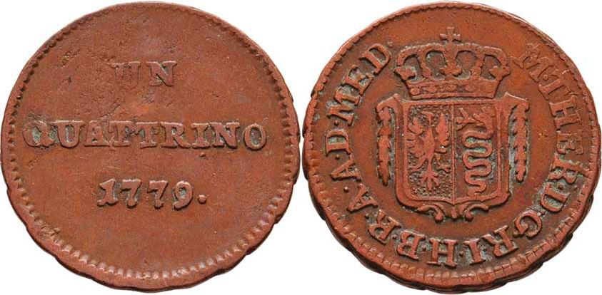 Cu Quattrino 1779, Milán, N.210b, Cr.4, 2.091g, nep.vady materiálu, nep.nedor., pěkná patina R!