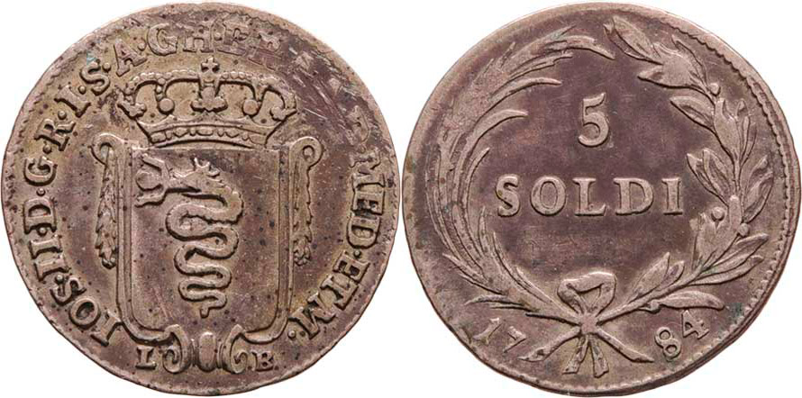 5 Soldi 1784 LB, Milán, P.41, Cr.41, 1.523g, nedor., dr.vady materiálu, dr.rysky, pěkná patina RR!