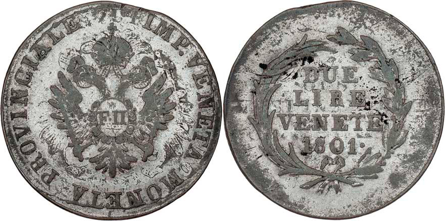 2 Lira 1801 - pro Benátky - dobře patrné stopy přeražby, P.29, 8.622g, hr., patina R!