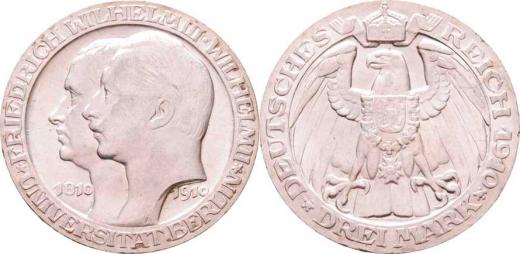 3 Marka 1910 A - universita Berlín, KM.530 (Ag900), 16.633g, dr.hr., nep.rysky, téměř