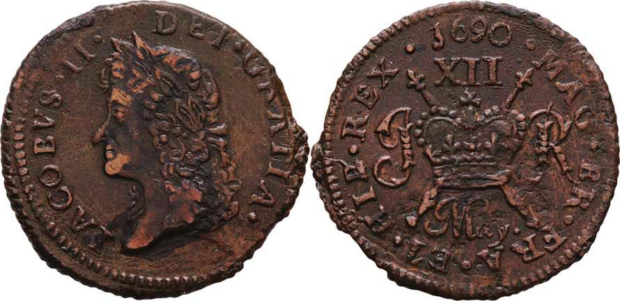 Shilling 1690 - May - nouzová mince občanské války, KM.100 (bronz), 4.456g, nepravidelný okraj, pat. R!