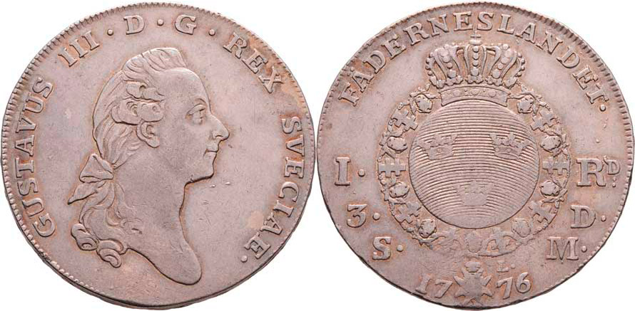 Riksdaler 1776 OL, KM.514, Dav.1735 (Ag878), 29.043g, nep.just., nep.hr., nep.rysky, pěkná patina R!