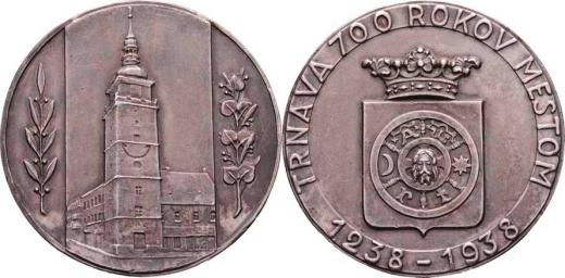 Trnava - na paměť 700.výročí povýšení na město 1938 - radnice, vavřínová a lipová ratolest / městský znak, opis, Nesign., Punc., pat. Ag987, 40mm, 29.250g, hr.