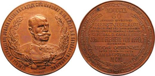 Generál Johann von Appel - velitel Sarajeva 1900 - poprsí mírně zprava ve věnci, německý opis / nápis a dva opisy na stuze, Sign., měď 50 mm, dr.hr., vl.rys.