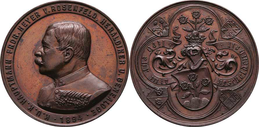 Fr.Heyer von Rosenfeld, heraldik a genealog 1894 - poprsí zleva, opis / rodový znak, nápis na stuze, Sign., bronz 37 mm, krásná patina