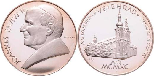 Jan Pavel II. - návštěva na Velehradě 1990 - poprsí zleva, opis / chrám, vročení, opis, Sign., Punc., Ag925, 60mm, 112.152g, původní etue
