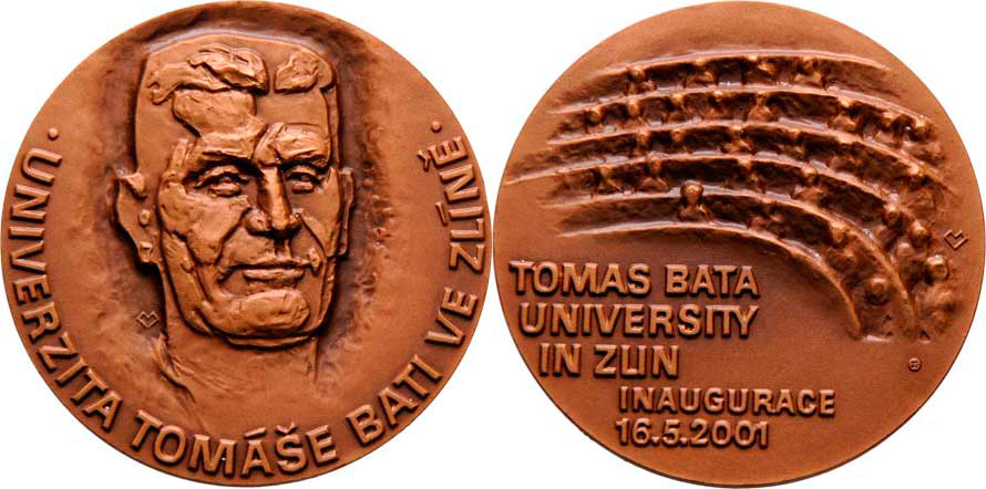 Universita Tomáše Bati - inaugurace 16.5.2001 - hlava čelně, opis/ studenti v posluchárně, 5-řádkový angl. nápis, Sign., patinovaný bronz 60 mm
