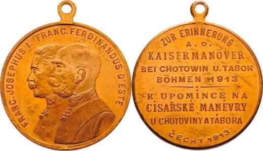 Chotoviny a Tábor 1913 (dělící čárka 2x6 mm) - dvojportrét císaře a následníka zleva, opis / nápis, M-B.86, zlacený bronz 29 mm s původním raženým ouškem